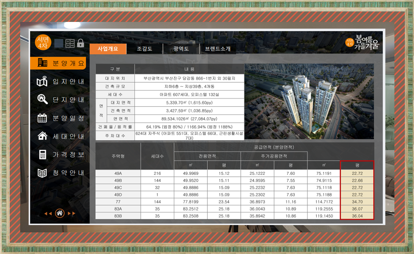 지하6층에서 지상39층까지 총 4개동에 이르며 세대수는 607세대의