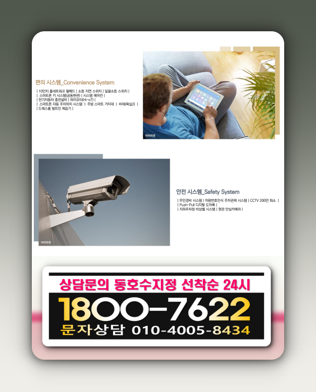 휴대폰 하나로 내 집 안의 상태를 제어하고 확인할 수 있는 시스템이 있어서 편리하고 이 외 유상옵션을 선택하면 최첨단 시스템을 모두 누리실 수 있습니다. 기본적으로 대기 전력 차단과 LED 조명을 사용하여 에너지는 줄이면서 활용하고 있습니다. 입주민들의 안전을 위한 것도 철저히 지키고 있습니다.